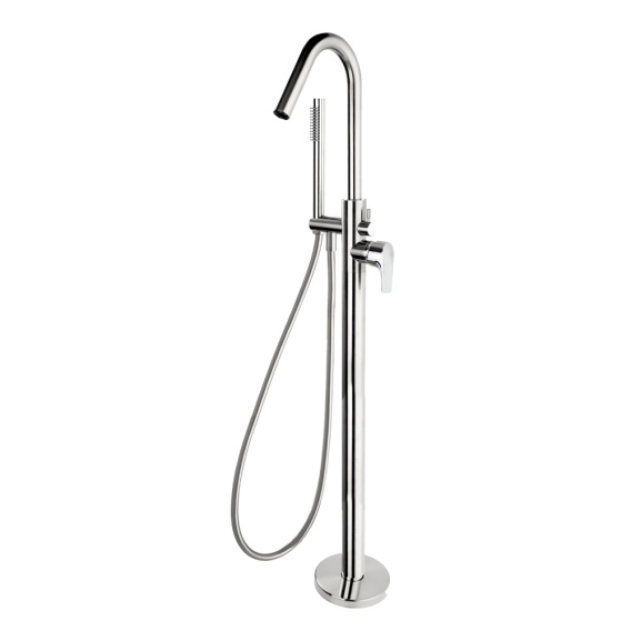 Wolnostojąca bateria wannowa o smukłej konstrukcji, wyposażona w zestaw natryskowy, wąż zapobiegający osadzaniu się kamienia oraz trwały system montażu na podłodze.