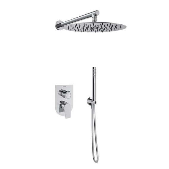 Zestaw prysznicowy metalowy, jednouchwytowy z dwukierunkowym sterowaniem i metalową głowicą natryskową Ø300 mm, z wyjątkowo płaską płytą metalową, łatwy w montażu dzięki kompaktowej obudowie, system oszczędzania wody S2 pozwalający na oszczędność 50% oraz ogranicznik temperatury.
