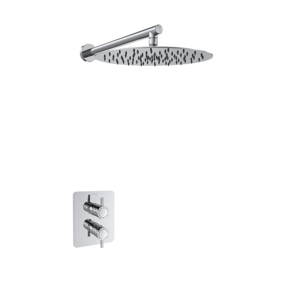 Zestaw prysznicowy termostatyczny do zabudowy, jednokierunkowy, z ultra płaską płytą metalową i metalową głowicą prysznicową o średnicy 300 mm.