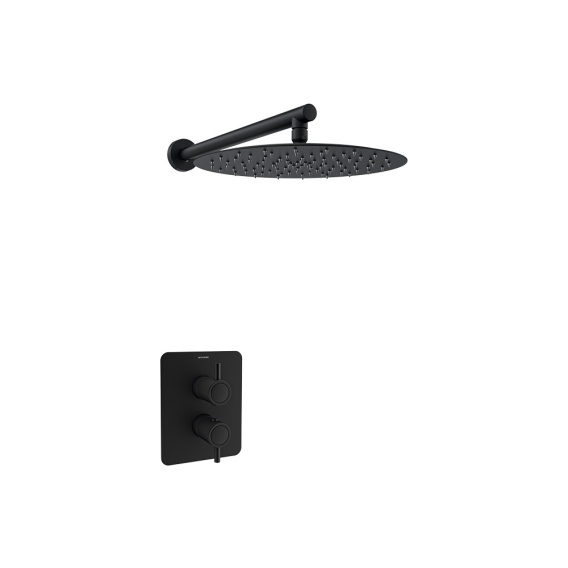 Zestaw prysznicowy termostatyczny do zabudowy, jednokierunkowy, z ultra płaską płytą metalową i metalową głowicą prysznicową o średnicy 300 mm.
