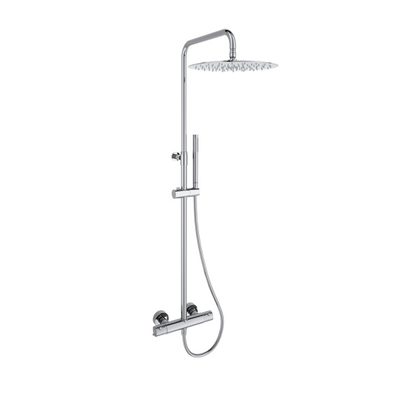 Teleskopowa kolumna termostatyczna z prysznicem ręcznym i metalową głowicą prysznicową o długości 300 mm, głowicą termostatyczną z systemem zabezpieczającym przed oparzeniem Hot Block i systemem blokady temperatury Termostop.