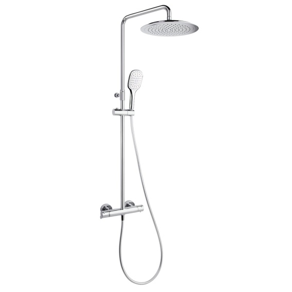 Ramon Soler Termostatyczna teleskopowa kolumna prysznicowa z okrągłą głowicą prysznicową o średnicy 300 mm. Wyposażona w system bezpieczeństwa Hot Block zapobiegający poparzeniom oraz system oszczędzania wody S2 z dwufazową dźwignią.