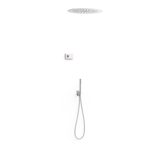 Tres SHOWER TECHNOLOGY Zestaw elektronicznej baterii termostatycznej podtynkowej 2-drożnej Shower technology prysznicowej. W zestawie elektroniczny sterownik z matą przeciwwilgociową firmy Schlüter.· W zestawie elektroniczna centrala mieszająca termostatyczna (2-drożna).· Deszczownica podtynkowa sufitowa ze stali nierdzewnej: Ø 500 mm.· Uchwyt do słuchawki prysznicowej z przyłączem w ścianie.· Słuchawka prysznicowa z mosiądzu systemem zapobiegającym osadzaniu się kamienia.· Satynowy wąż.